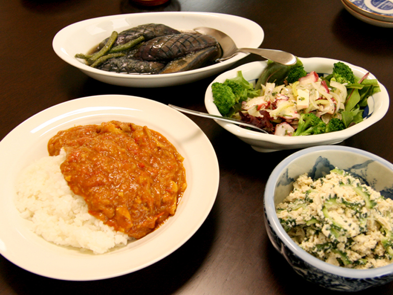 前日に料理撮影があったので、この日のランチはとっても豪華!スタッフやクライアント様の昼食用として、作っておいたカレーと揚げ浸しに、撮影で余った白和えとマリネです。