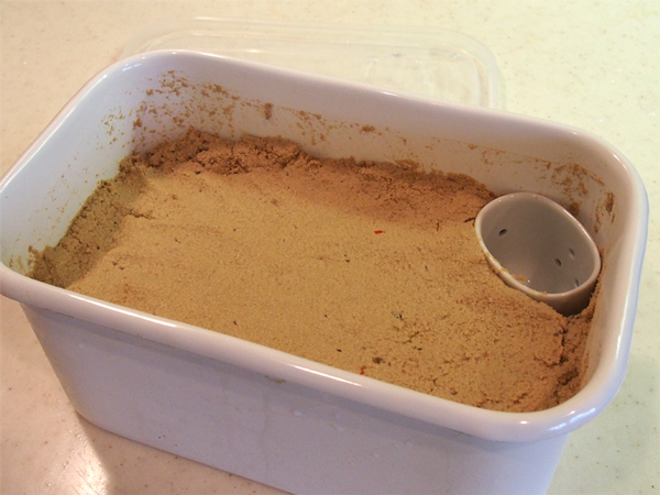 味の調整もだんだん上手になってきました。というのも、塩とくず野菜だけでは味に深みが出ないんですよね。味のアクセントとして「唐辛子」や「山椒の実」を、うまみ追加として「しいたけ」などの乾物袋にたまったくずなどを入れています。あと我が家で愛用のだし醤油を作る瓶があり、その中で1年間たっぷり醤油に浸かっていた鰹節も小さく切り崩して混ぜ込んでいます。おかげで、混ぜてるときからぬか床もたべられそうないいにおいがします。(残念なことにうちのオットはぬか漬け嫌いで、混ぜるときは一声かけ退室しています)